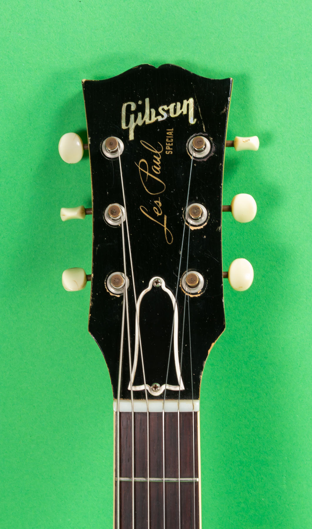 Hi everyone. I do not usually buy these but this guitar really appeals to me, so now I have to explain myself. This guitar is not too beat up, it is kind of the opposite of that, not worn, clean. The weight is 7 pounds 15 1/2 ounces. It is a Les Paul and under 8 pounds. If you look close only at the front of the headstock you can see it had other tuners. I only looked at the rest of the guitar when I bought it, I can get rather excited some times. The case is an original 50s brown case. This is a nice original example, the color is pleasing.