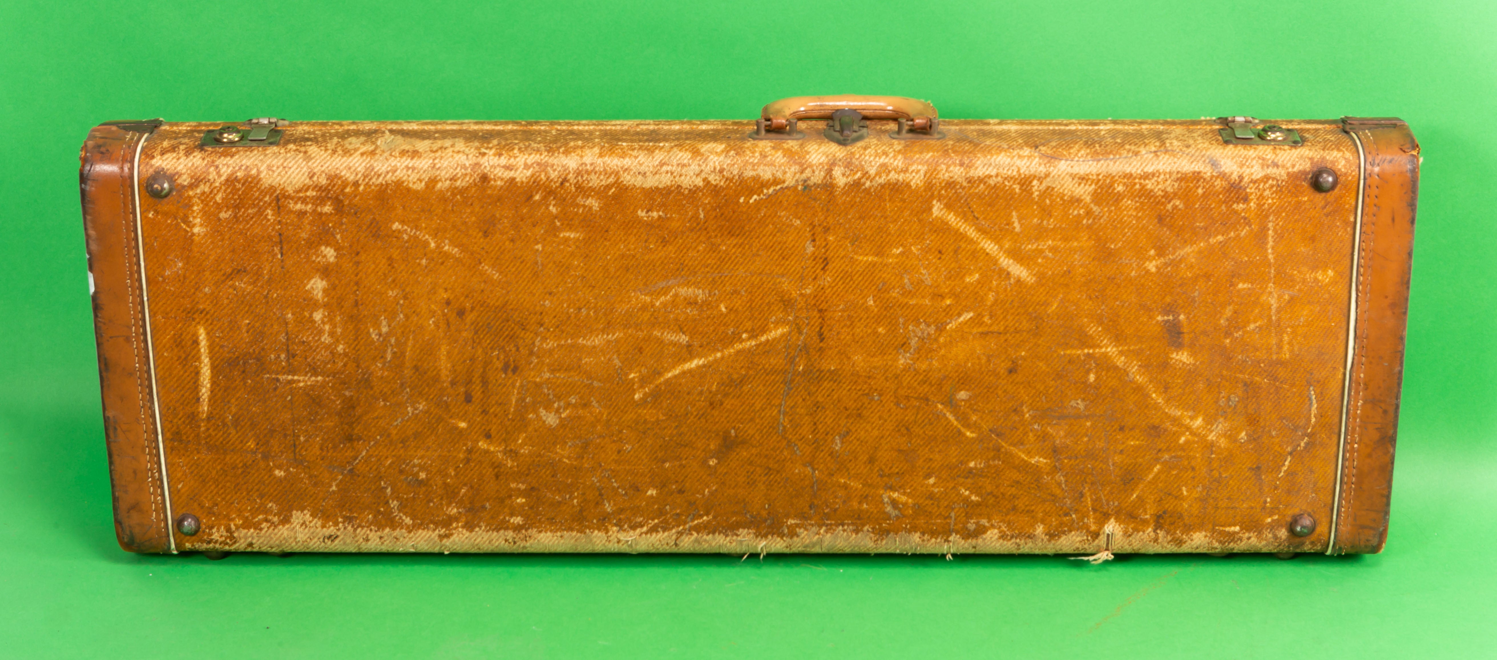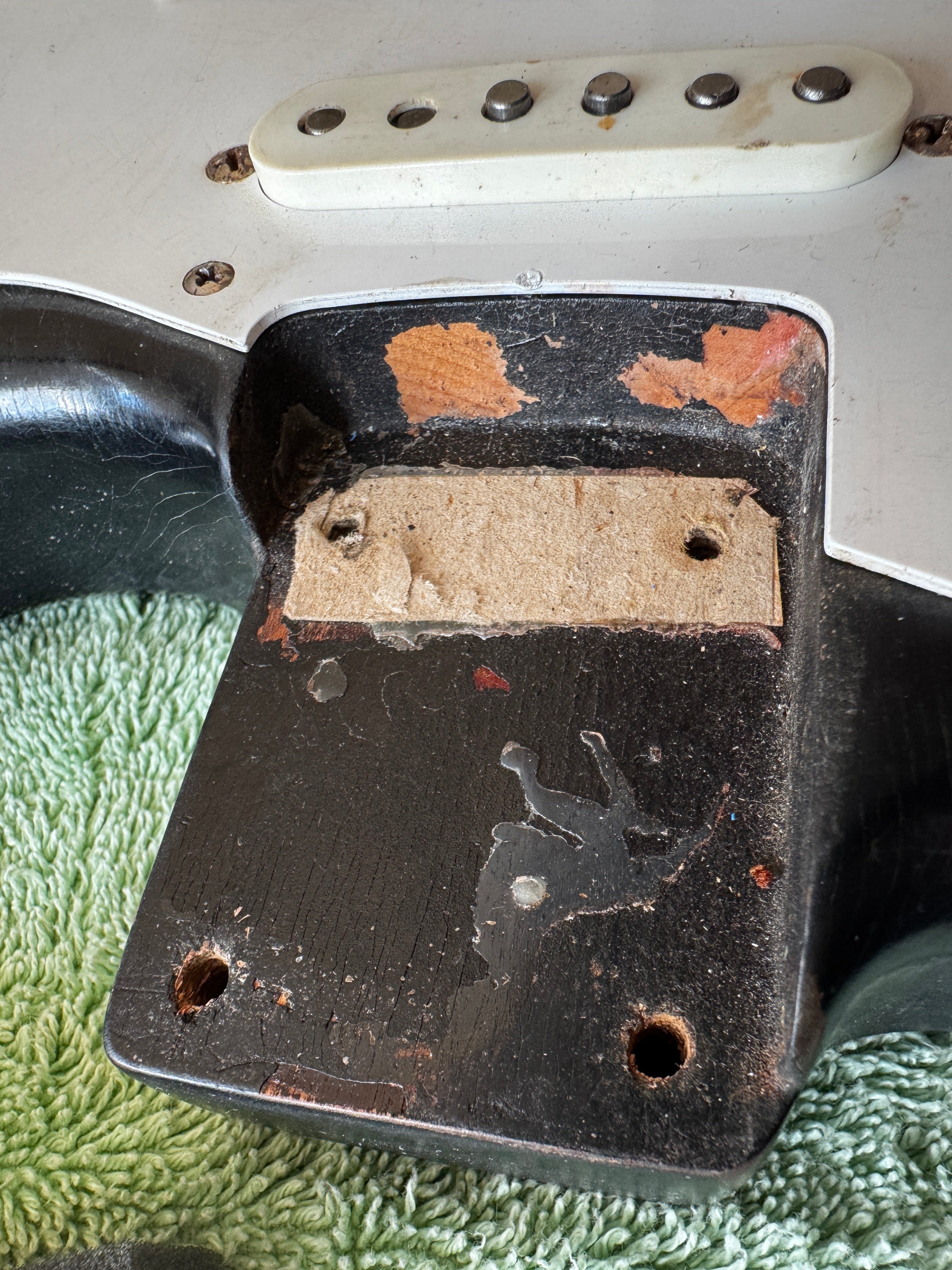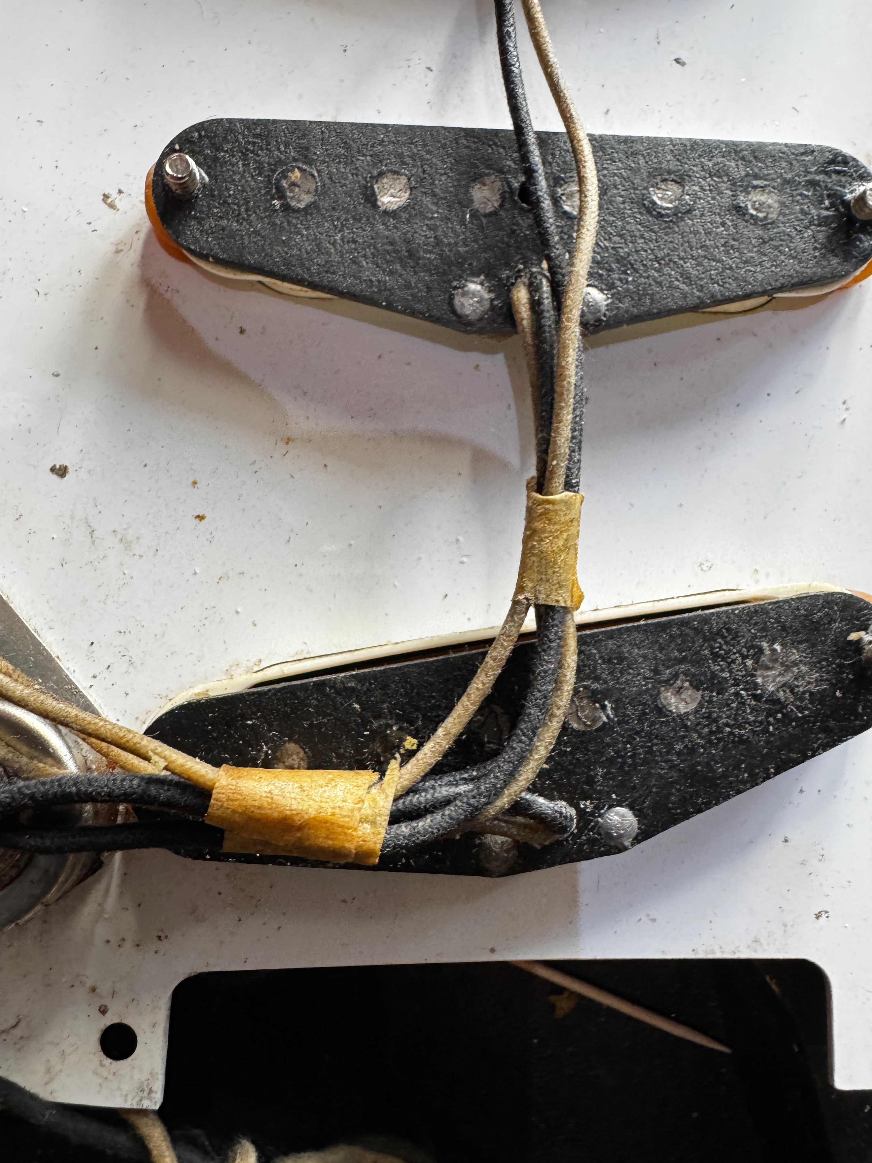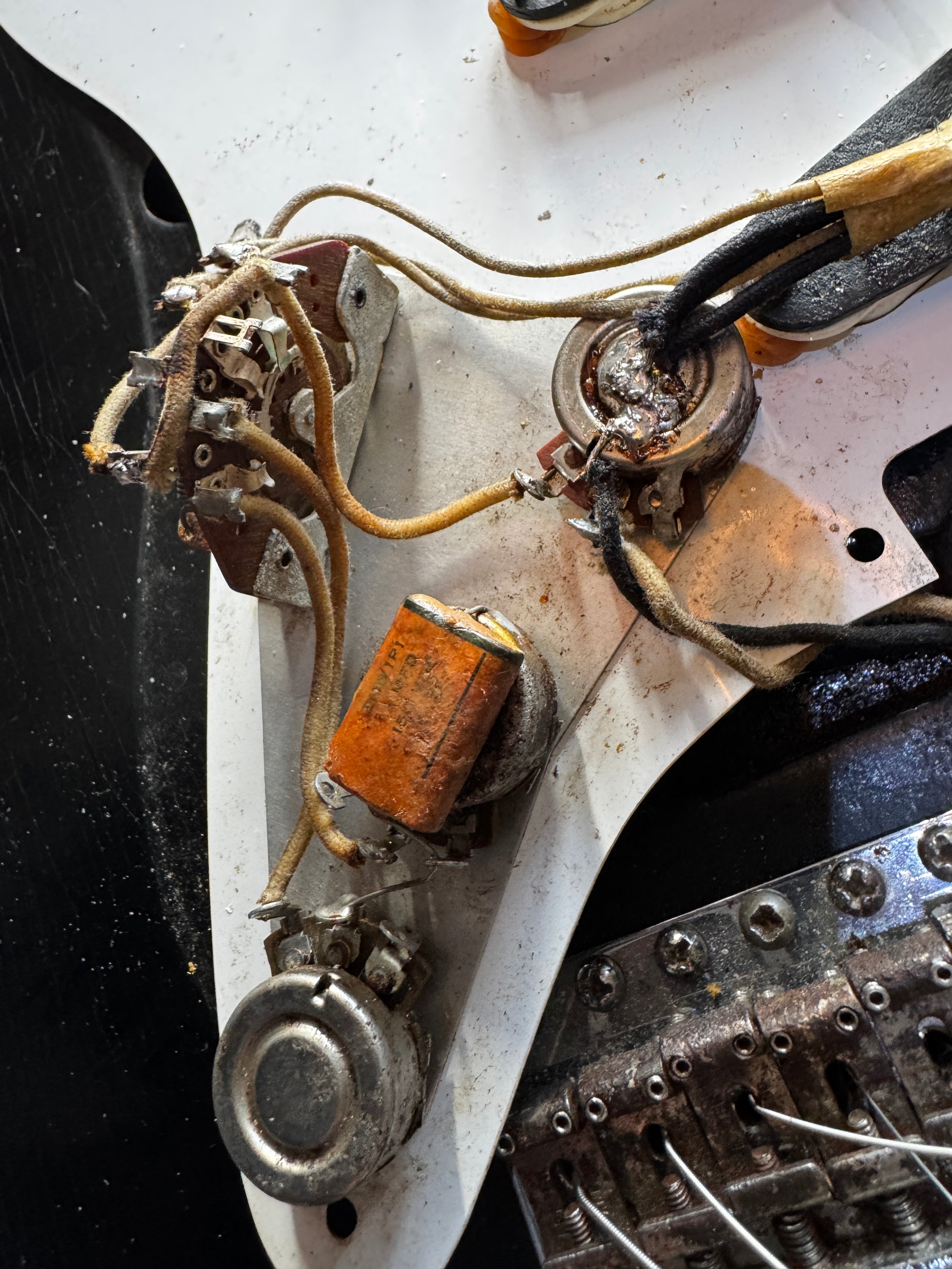 The body finish on this guitar is black. It was painted by someone decades ago but is refinished. It has patina like an original 50s guitar. The finish on the neck we think could be original but not on the headstock, the logo has been replaced. The parts are original and the guitar comes with an original tweed case. The pots are all dated 304 723.... as usual. Many of these 1957 Stratocasters have that pot date. No neck date can be seen. The neck is a typical 1957 V neck that is the perfect size. I will check the weight. The front pickup is rewound by Lindy Fralin. There are no repairs or damage to the wood, it is intact.