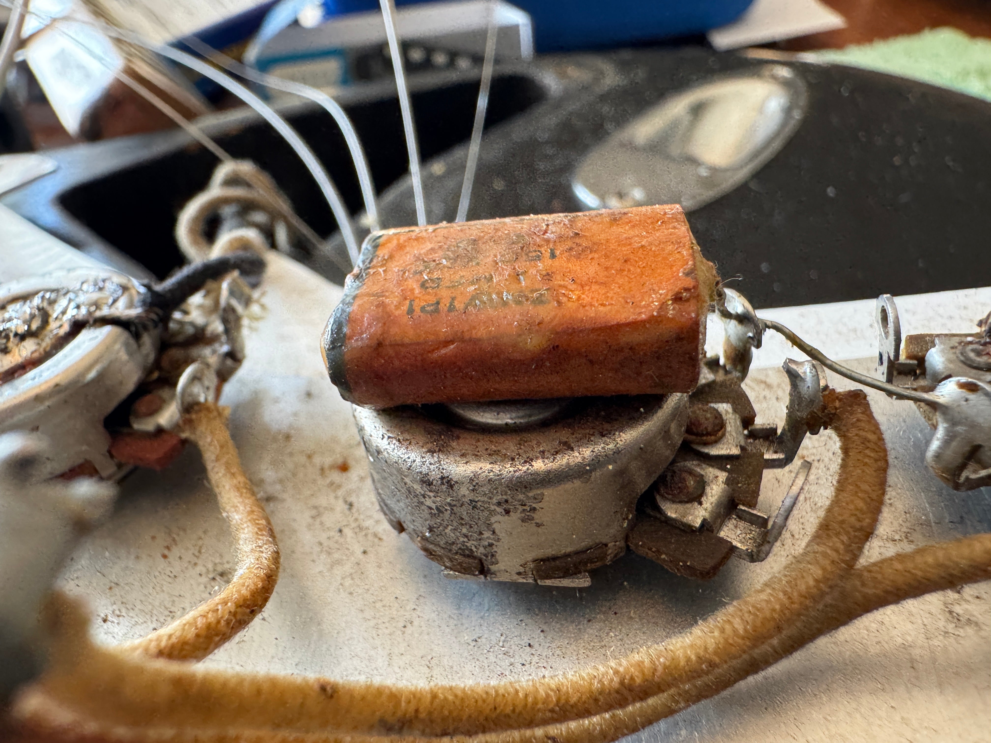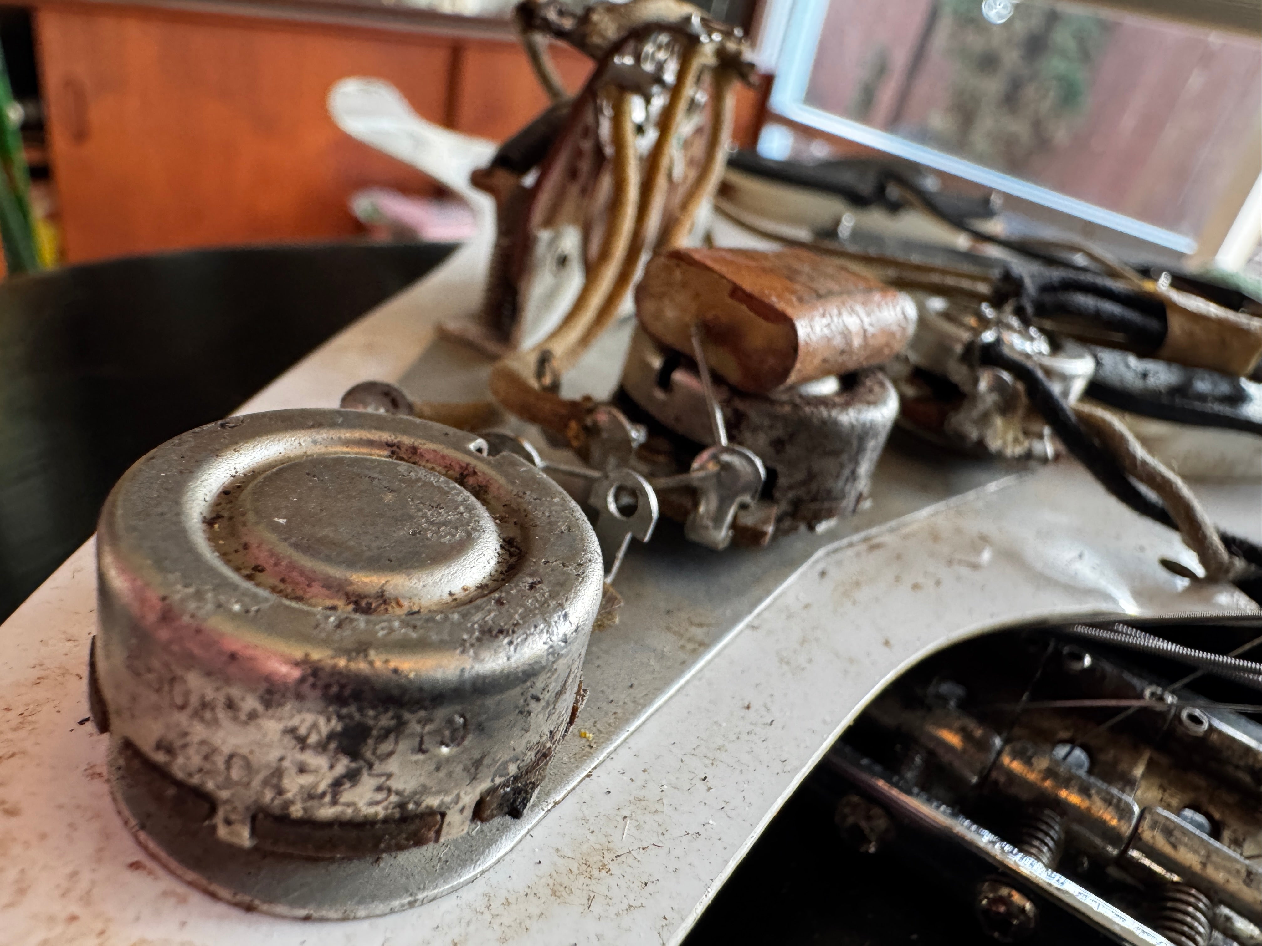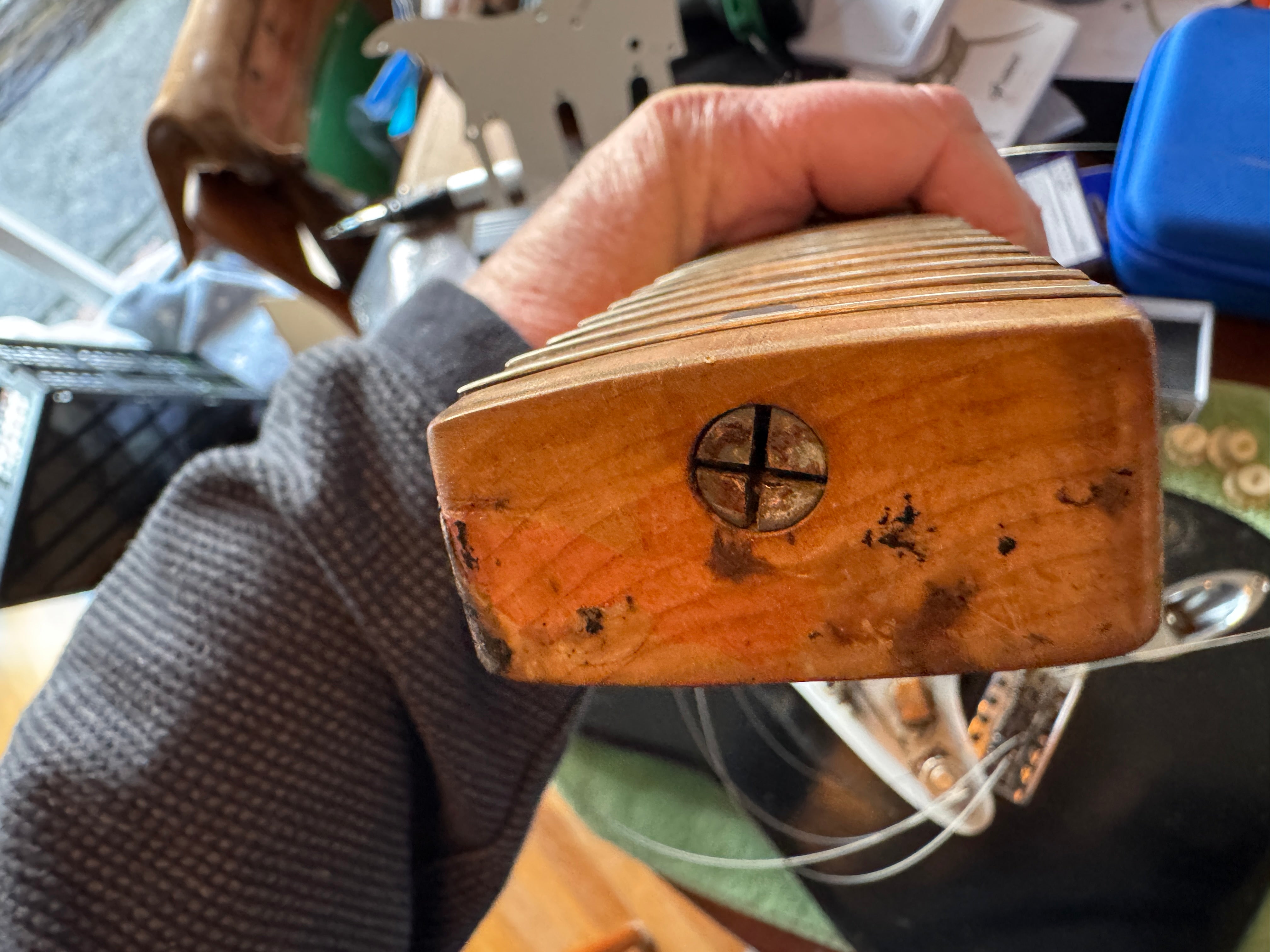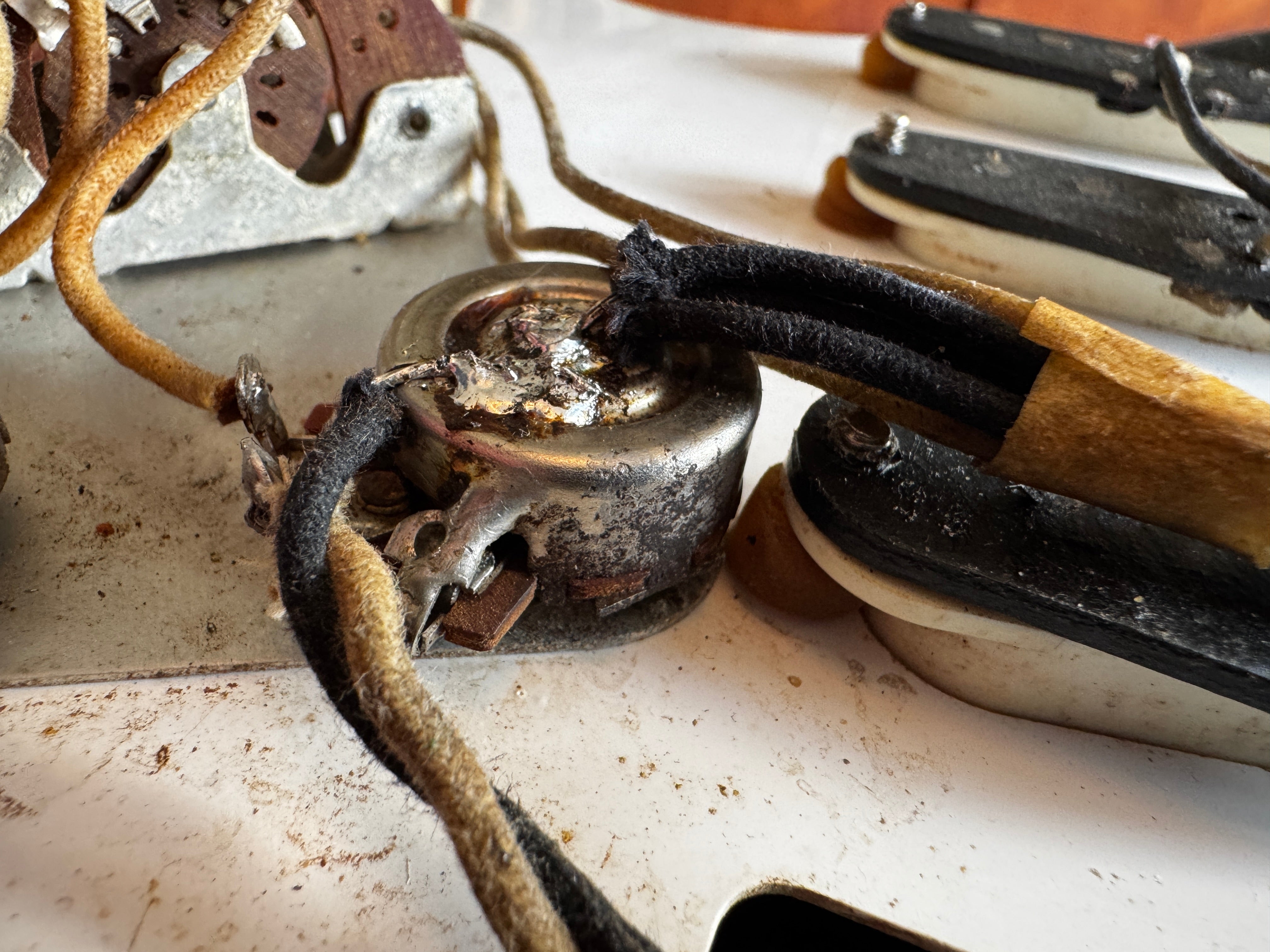 The body finish on this guitar is black. It was painted by someone decades ago but is refinished. It has patina like an original 50s guitar. The finish on the neck we think could be original but not on the headstock, the logo has been replaced. The parts are original and the guitar comes with an original tweed case. The pots are all dated 304 723.... as usual. Many of these 1957 Stratocasters have that pot date. No neck date can be seen. The neck is a typical 1957 V neck that is the perfect size. I will check the weight. The front pickup is rewound by Lindy Fralin. There are no repairs or damage to the wood, it is intact.