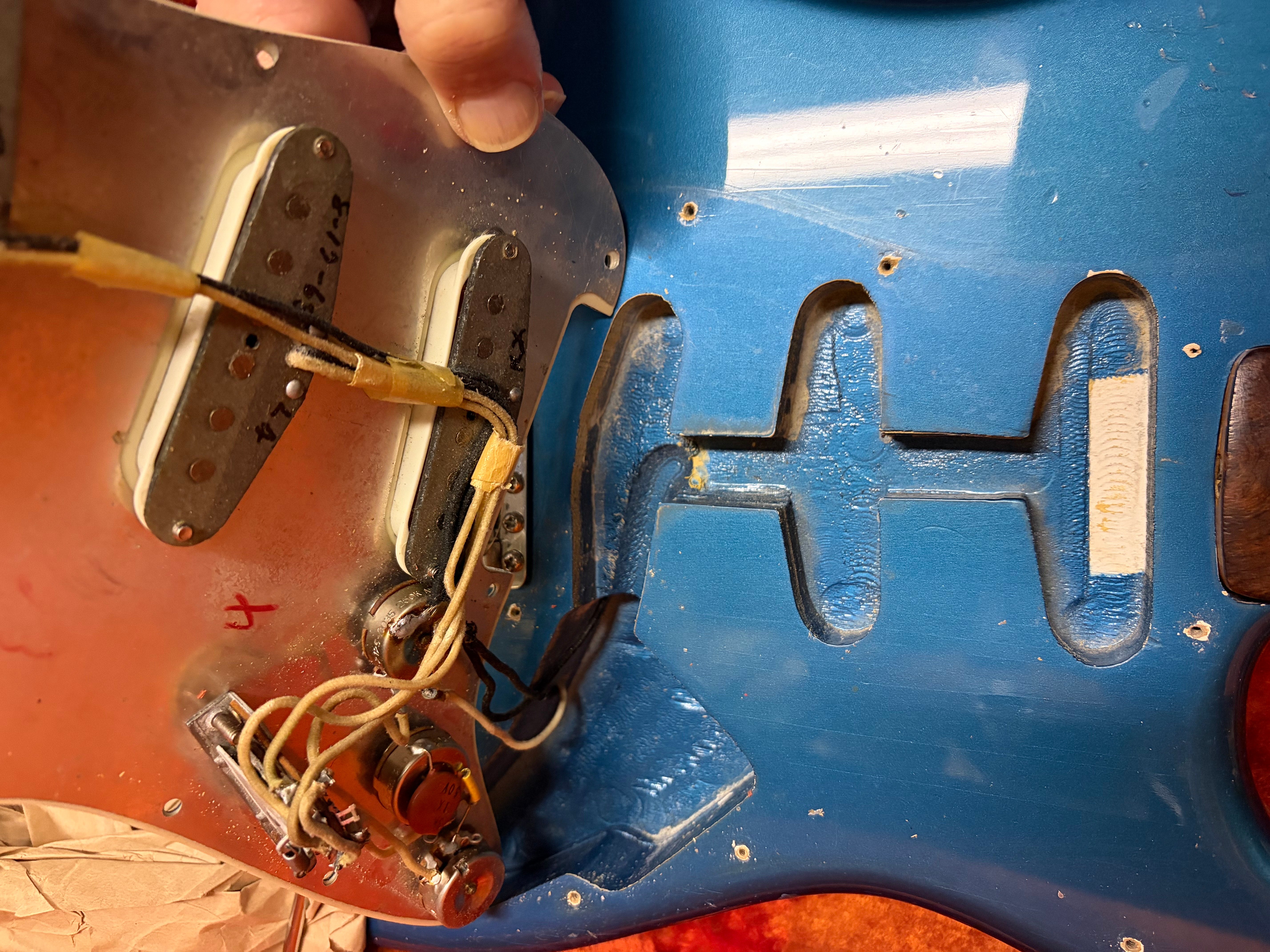 Great L series pre CBS guitar in the ever popular Lake Placid Blue with original green pick guard. This a nice original custom color guitar and the color is still blue not so faded as some. A five way switch did reside here at some moment  but the three way is here, as is everything else,nothing is missing. More pictures will be added next week.