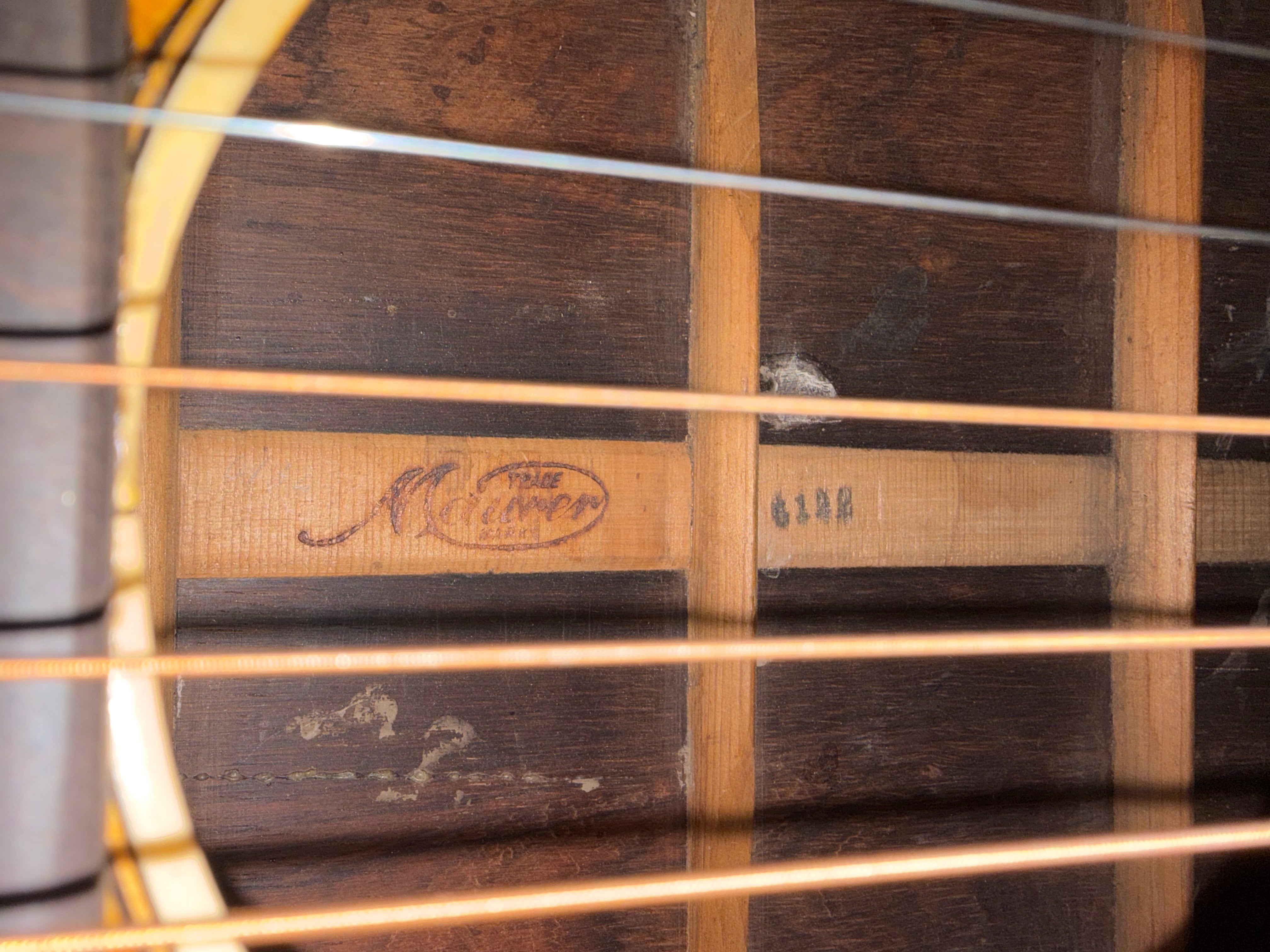 Decent size circa 1925 guitar with a 14 inch lower bout (bout what?) and a 25 inch scale length. This is a great sounding loud and clear guitar that will fill the room with musical tonality! Restoration on this guitar was done by Joel Whitehead who does excellent work and also has great sneakers usually. The fingerboard has been replaced and there is a good amount of overspray and refinishing on the body, not as much on the neck.
