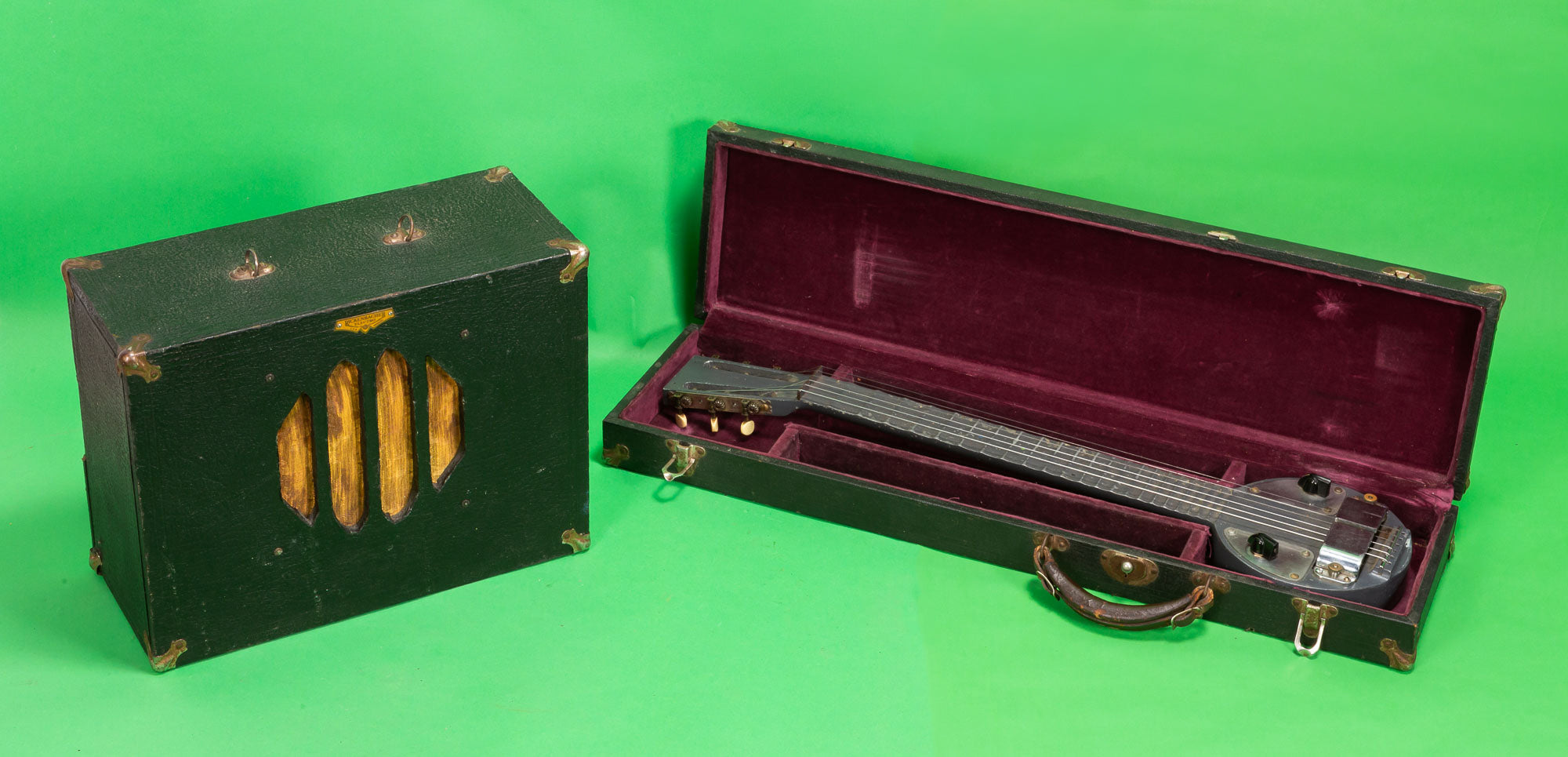 Circa 1930s. This one is kind of unusual. The guitar has dual controls. It is also painted gray. The serial number is B366. The badge is missing from the headstock.The original case is included and also this is being sold as a set