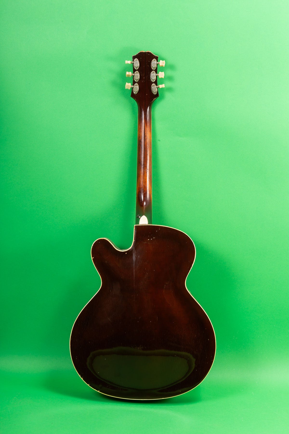 Here is an early cutaway electric guitar from Epiphone, pre Gibson made, pre overseas Epiphone and pre… me. This is an old one. There may have been an incident. There is a post under the bridge on the treble side under the damage that can be seen on the front. Something must have happened. No animals were injured.