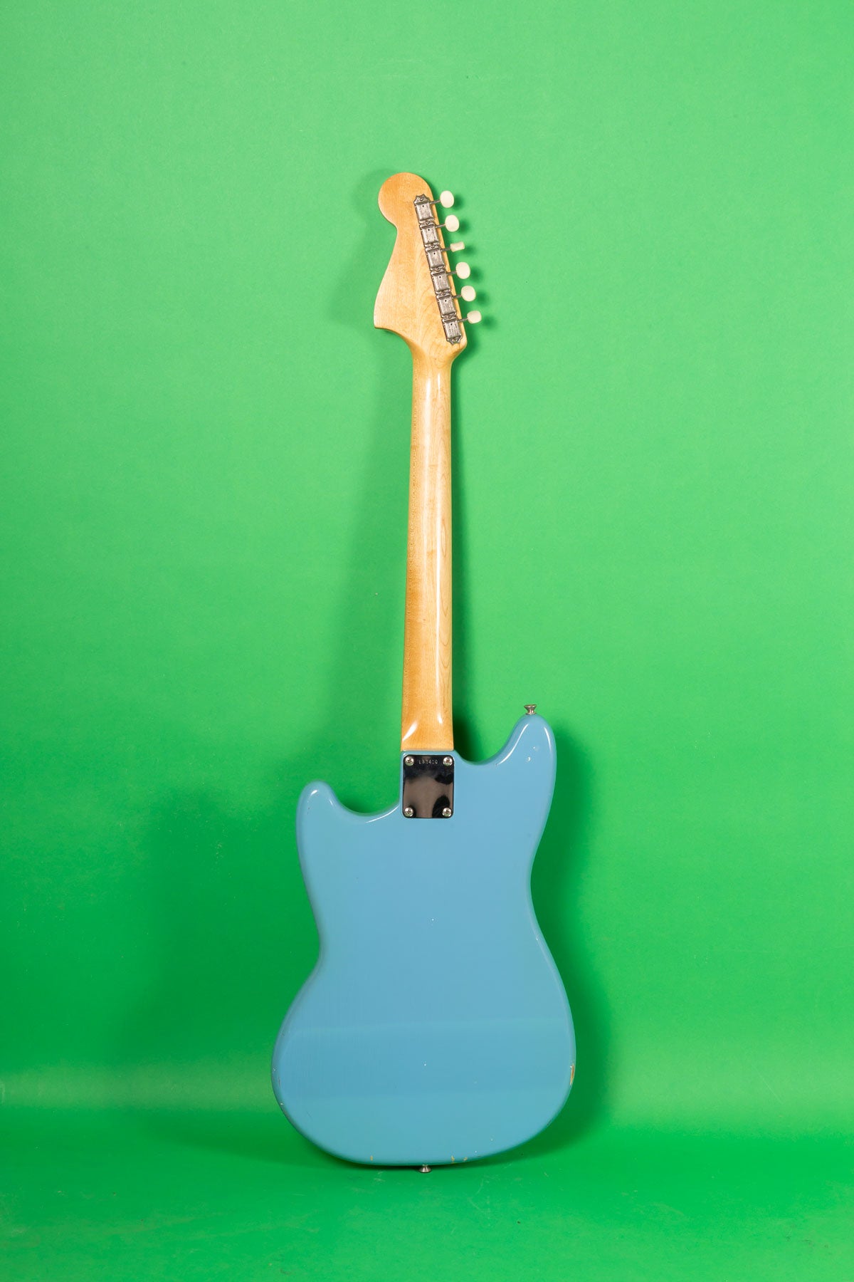Sometimes when I see a guitar for sale I get pretty excited about the guitar and then I buy it. This is one. This is a sort of rare very early example of the new improved Duosonic model, one of the first to have the longer 24 inch scale length. The neck is an "A" neck with a 24 inch scale, the later Duosonics were available with a "B" width neck. The Duosonic II and Musicmaster II were introduced along with the new Mustang model and share features but have perhaps a better bridge tailpiece situation, unless tuning and re tuning guitars is your passion.